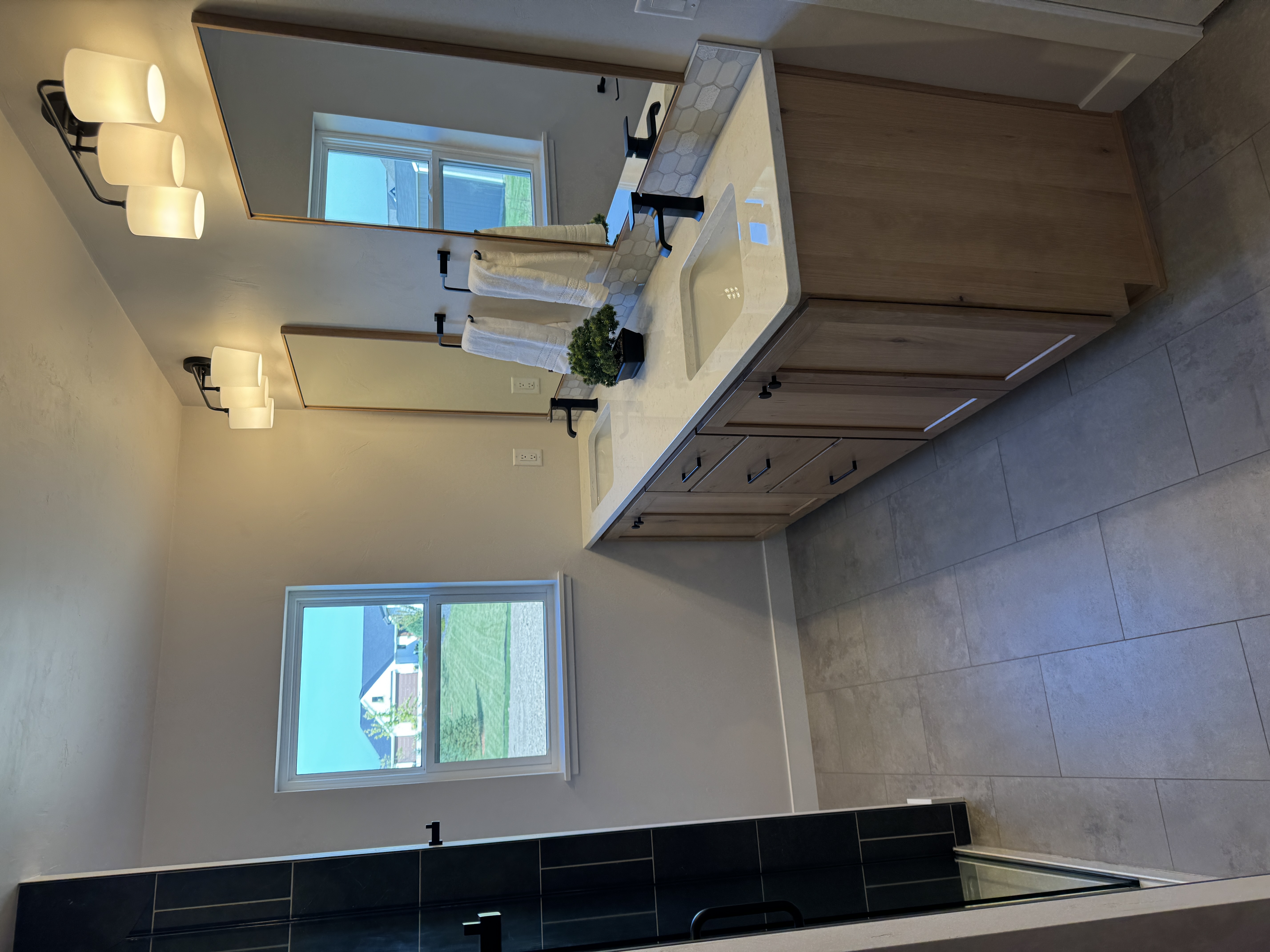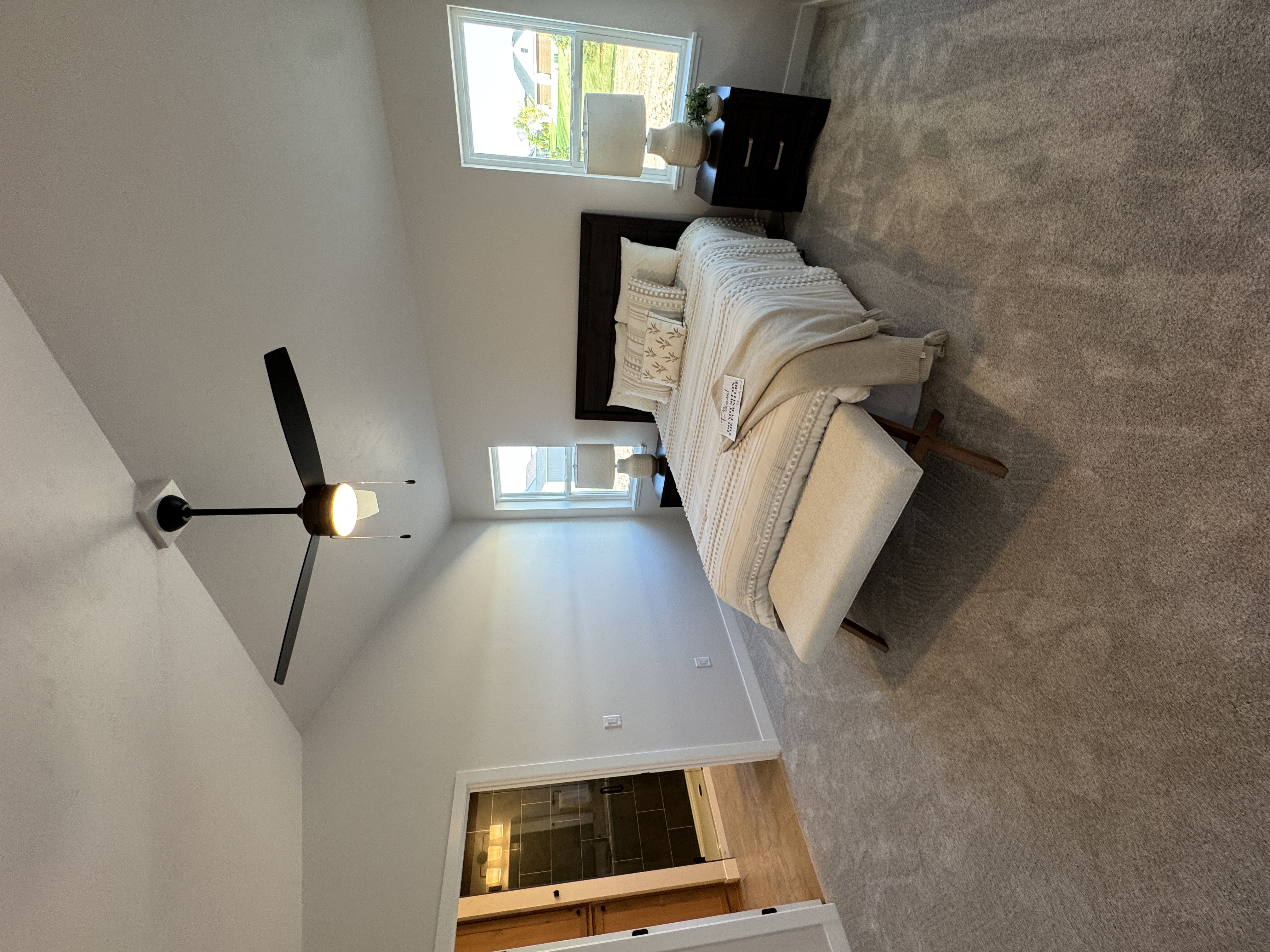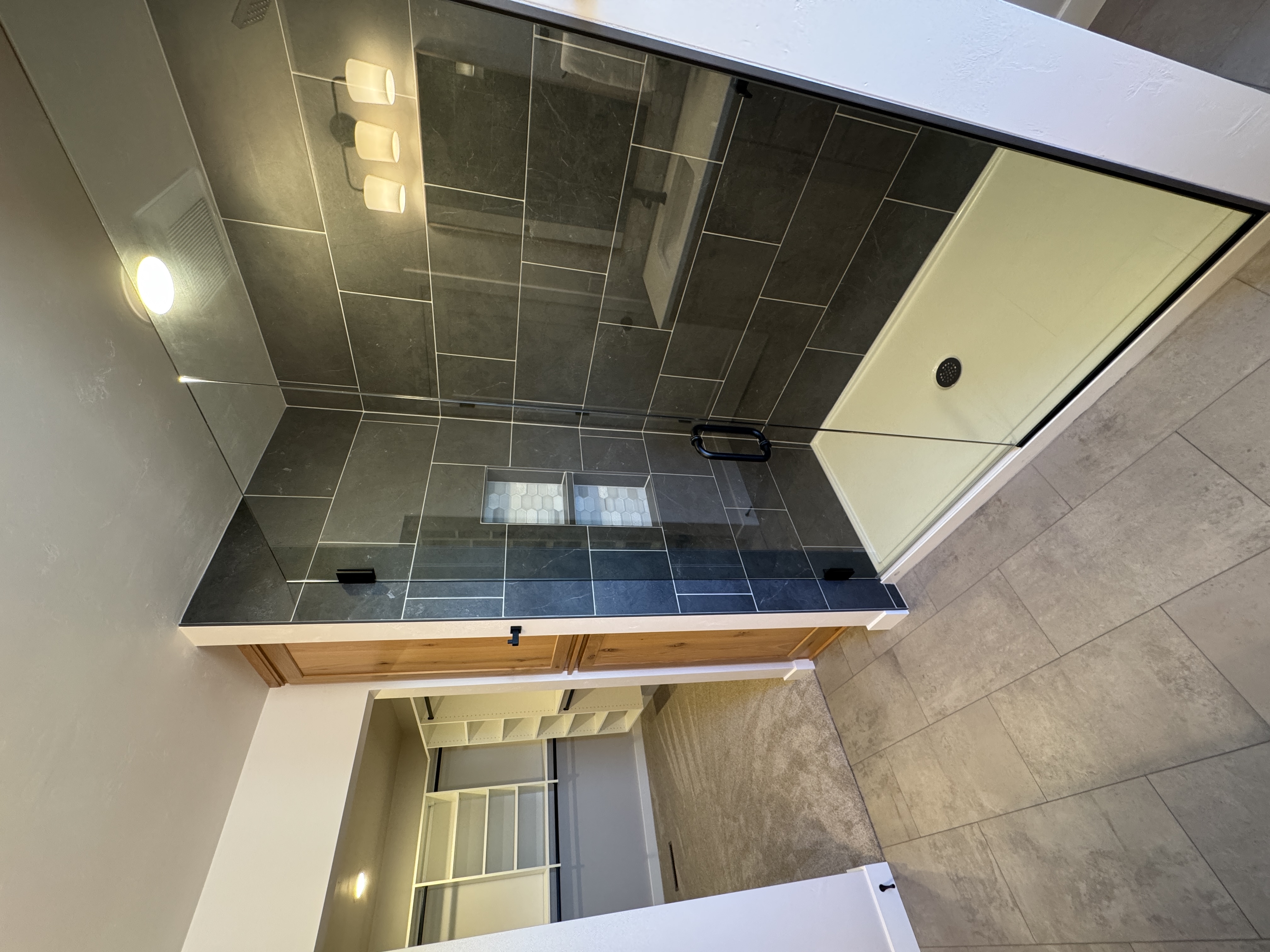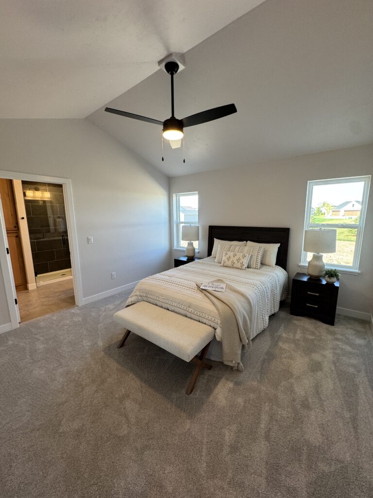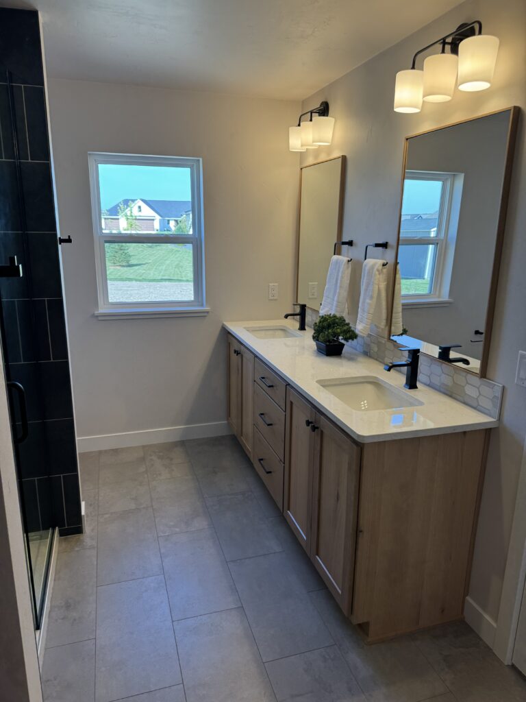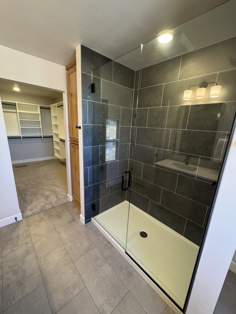 The primary suite includes a tile shower, walk-in closet, and a custom vanity with dual sinks and solid-surface counters.